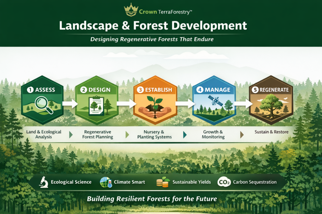 Sustainable Land Development & Forest Restoration program transforms idle, degraded, or underutilized land into productive, income-generating agroforestry estates while restoring ecological function.